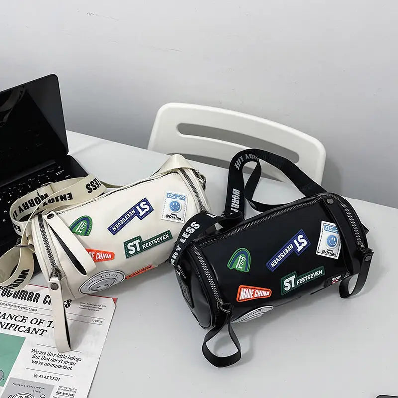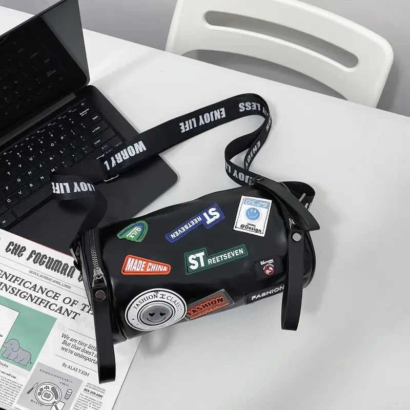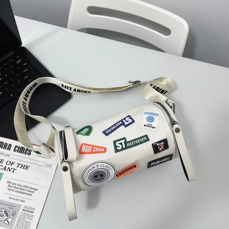 Trendy single-shoulder handbag crafted from premium PU material with a sleek cylindrical silhouette. Features a bold brand letter badge, golden-tone hardware, and secure buckle closure. Lightweight and structured for everyday use or upscale styling. Ideal for casual outings, events, or gifting. Available in black and white.