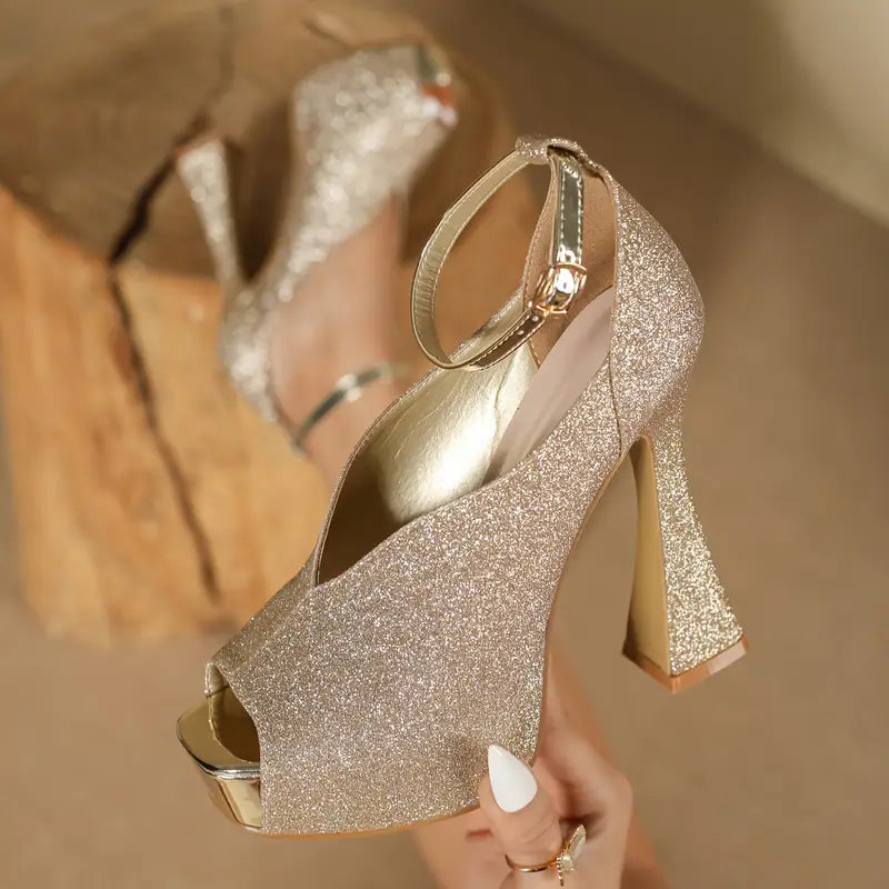 European & American Super High-Heeled Shiny Sandals – Sexy Waterproof Platform Fishmouth Shoes with Flare Heel & Square Toe for Parties & Fashion Events
