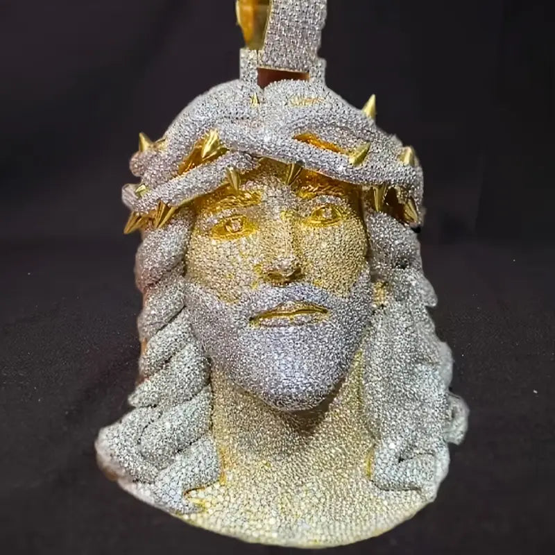 Make a powerful style statement with this fully iced-out Jesus pendant crafted from genuine 925 sterling silver and plated in two-tone gold. Featuring a bold 3D design and encrusted with high-grade VVS1 synthetic moissanite stones, this pendant delivers unmatched brilliance and hip-hop luxury. Ideal for daily wear, parties, or gifting, it’s a standout piece for anyone who appreciates bold jewelry and spiritual symbolism. Available in multiple sizes and shipped from a local warehouse for fast delivery.