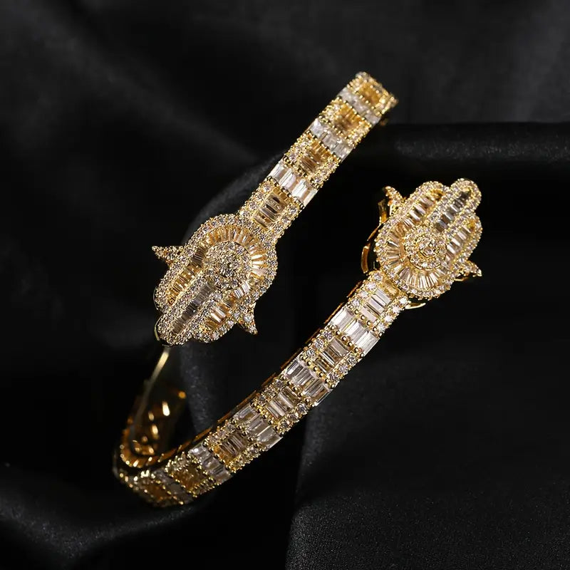 Fatima Hand Bracelet – Hip-Hop Style Palm Design with Synthetic Zirconia, Copper Base, 8-Inch Fit in Golden or Silvery Finish