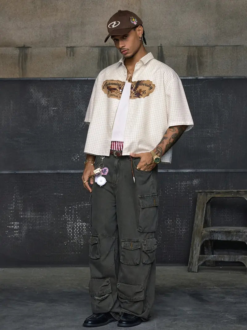 Bring vintage energy to your summer wardrobe with this men's retro plaid print shirt, designed in a short sleeve silhouette with a relaxed fit for breathable comfort. The classic button-up front and woven polyester-spandex blend offer structure and ease, while the bold checkered pattern channels timeless streetwear appeal.