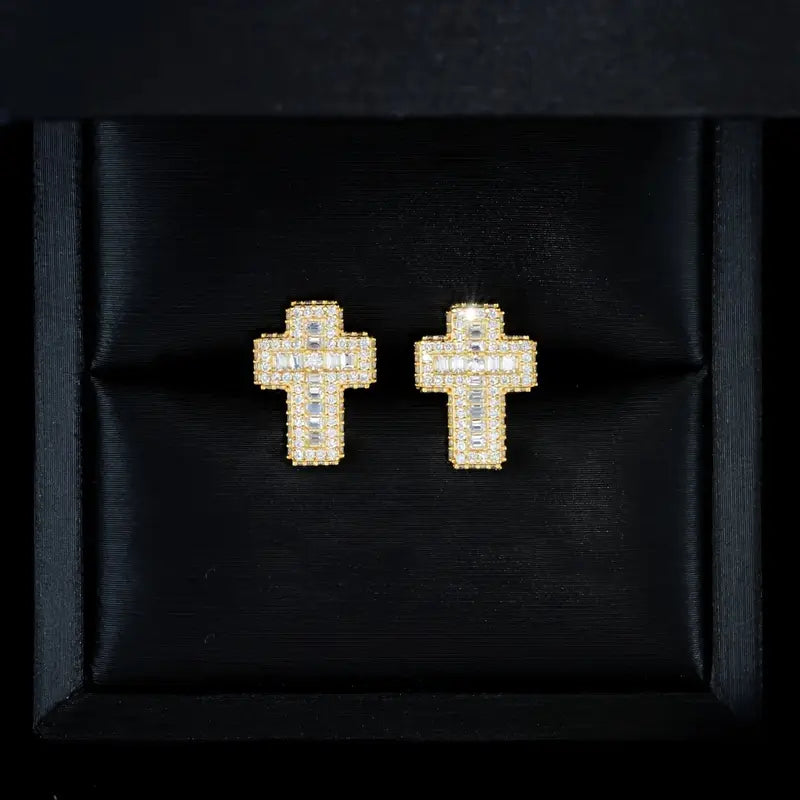Make a bold statement with these dazzling cross-shaped earrings, crafted from premium S925 sterling silver and adorned with VVS1-grade moissanite stones. Designed for both men and women, these earrings combine spiritual symbolism with high-end hip-hop fashion. The baguette-cut stones offer brilliant sparkle, while the durable silver base ensures lasting shine and comfort. Perfect for parties, concerts, or everyday wear, they’re a standout accessory that blends luxury with street style.