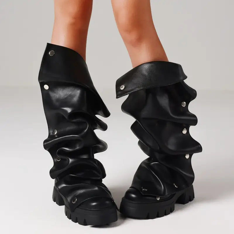 Women’s Chunky Platform Mid-Calf Boots – Punk Style Pull-On Design with Non-Slip Rubber Sole & Glossy PU Cover