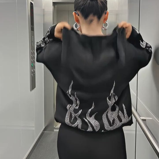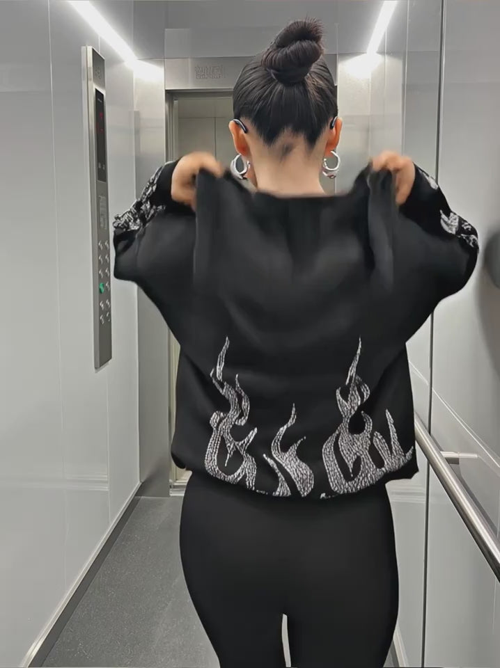 Women's Y2K Hip-Hop Hoodie with Black Flame Graphic Zip-Up Sweatshirt Loose Fit Streetwear Pullover